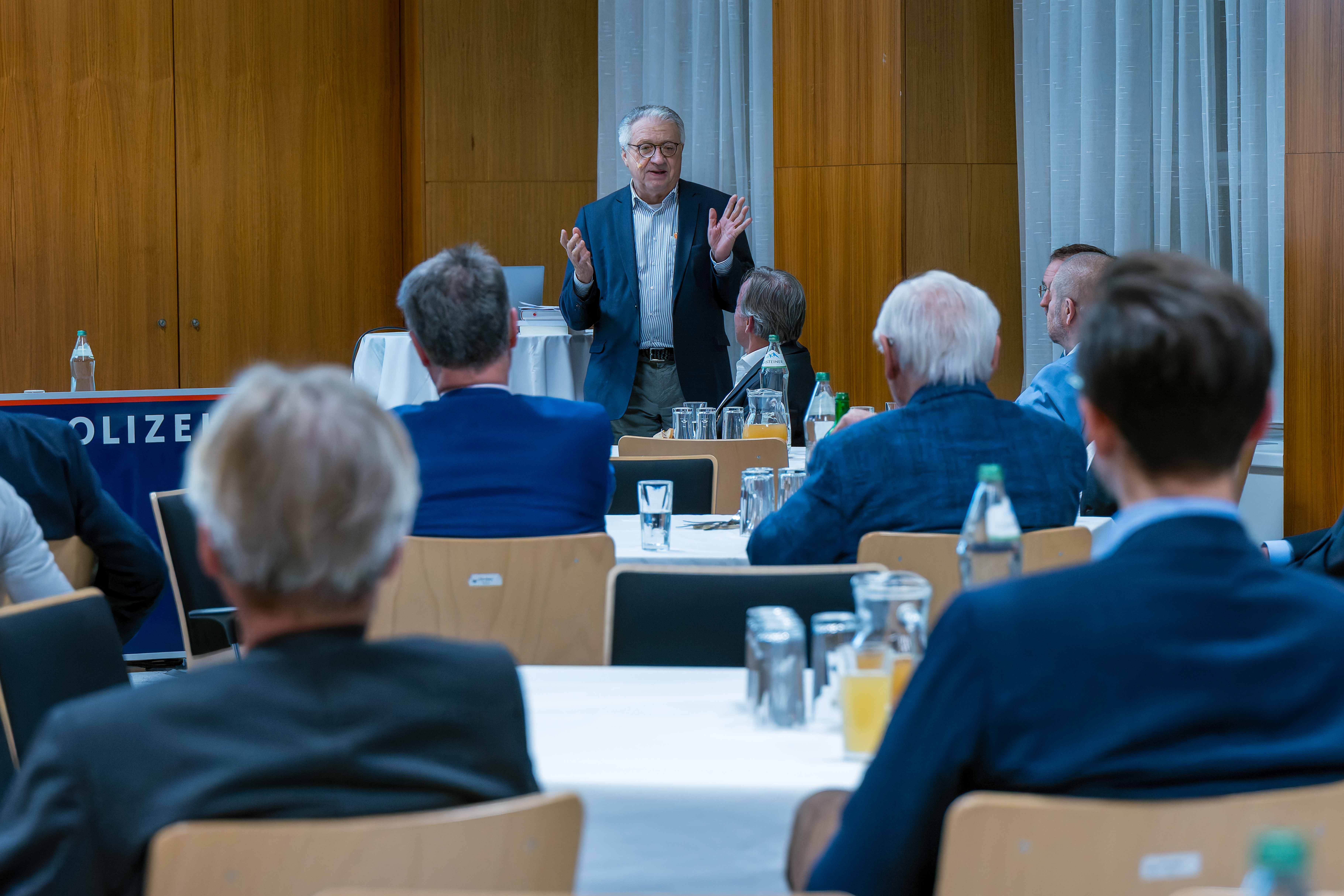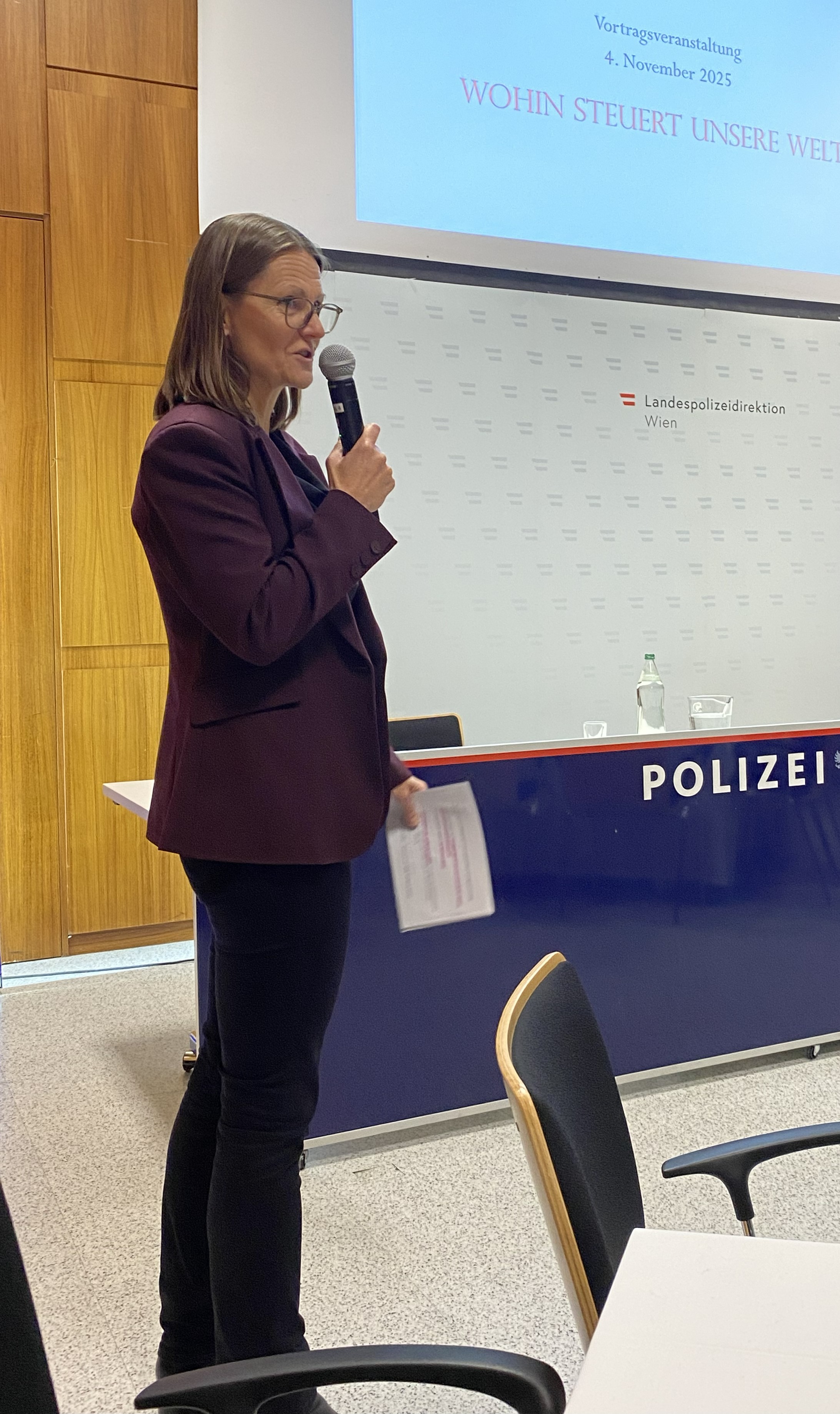 GS Mag. Josef Koppensteiner, Polizeipräsident Dr. Gerhard Pürstl, Dr. Wolfgang Petritsch und Vereinspräsident KR Karl Javurek (v. l.) bei der Veranstaltung. Foto: LPD Wien / Gilbert Brandl KR Karl Javurek, Präsident des Vereins der Freunde der Wiener Polizei, verwies in seiner Begrüßung auf die allgegenwärtigen Hiobs-botschaften in Medien und Zeitungen – von wirtschaftlichen Krisen über kriegerische Auseinandersetzungen bis hin zu Angriffen auf demokratische Institutionen: „Wir leben nicht mehr auf einer Insel der Seligen. Die multiplen Krisen überfordern uns zunehmend", so Javurek. Es dränge sich die Frage auf, "Wohin steuert unsere Welt?". Landespolizeipräsident Dr. Gerhard Pürstl betonte die "exzellente Kooperation mit dem Verein der Freunde der Wiener Polizei", die dafür ausschlaggebend sei, dass er gerne den Festsaal in der Polizeidirektion für Vorträge zur Verfügung stelle. Bei allen beunruhigenden News rundum gebe es "seitens der Wiener Polizei keine Hiobsbotschaften", stellte Pürstl fest: "Nach wie vor zählt Wien zu den sichersten Städten der Welt!"